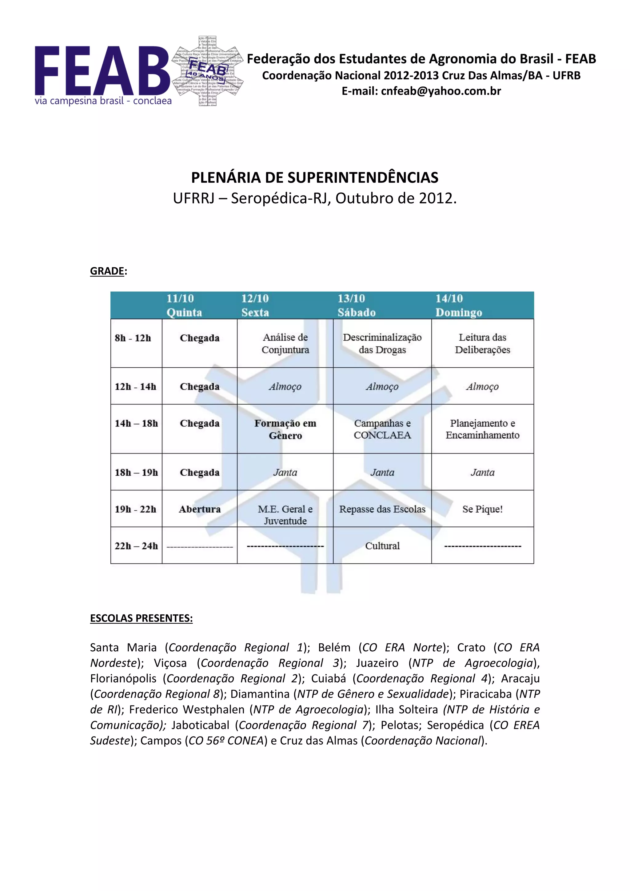 O documento resume as discussões de uma plenária da Federação dos Estudantes de Agronomia do Brasil (FEAB) sobre análise de conjuntura e questão agrária e formação em gênero. Escolas de agronomia de todo o país participaram e debateram temas como o neoliberalismo, o papel do PT no governo, a luta contra a opressão de gênero e sexualidade, e os desafios de levar esses debates para as comunidades rurais.