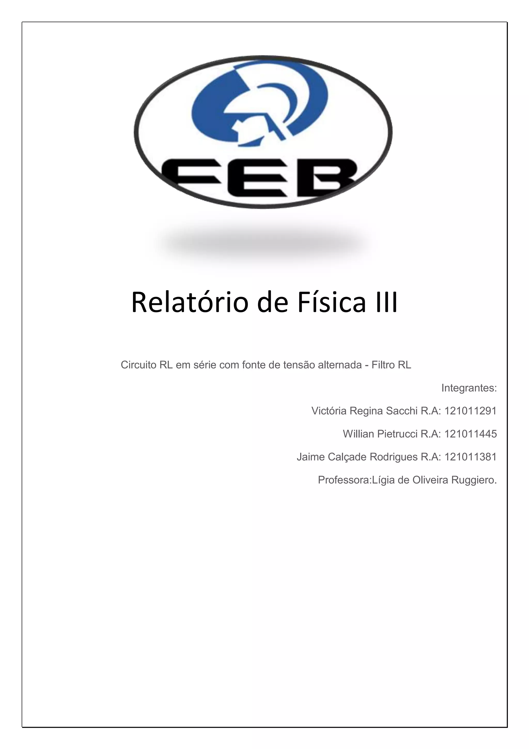 O documento apresenta os resultados de um experimento com um circuito RL em série com uma fonte de tensão alternada. Foram coletados dados de tensão no resistor e indutor para diferentes frequências e utilizados para calcular impedância, reatância indutiva e corrente. O circuito atua como um filtro passa-baixa com frequência de corte estimada em 1,7MHz a partir de fórmula e 1,85MHz a partir de gráfico dos dados.