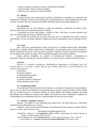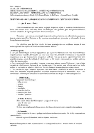 Este documento fornece orientações para a elaboração de relatórios de estágio de enfermagem. Ele explica que um relatório é um documento que relata atividades ou presta contas de ações. O documento então detalha a estrutura recomendada para relatórios, incluindo uma folha de rosto, sumário, introdução, corpo, considerações finais e anexos. Ele fornece exemplos do que incluir em cada seção para fornecer uma descrição completa das atividades de estágio.