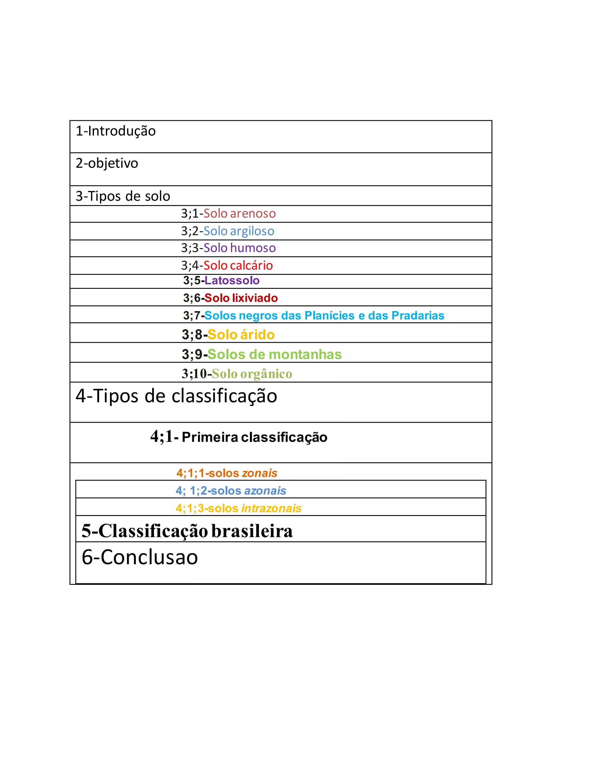 Neossolo, Nitossolo, Organossolo, Planossolo, Plintossolo eVertissolo.