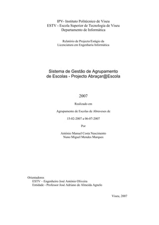 Este relatório descreve um sistema de gestão para um agrupamento de escolas denominado de Abraçar@Escola. O sistema foi desenvolvido para facilitar a disseminação e partilha de informação entre alunos, professores, pais e a comunidade em geral. O sistema inclui funcionalidades como gestão de conteúdos, agenda de eventos e um fórum. O projeto foi desenvolvido usando tecnologias como ASP.NET, SQL Server e AJAX para fornecer uma solução baseada na nuvem.