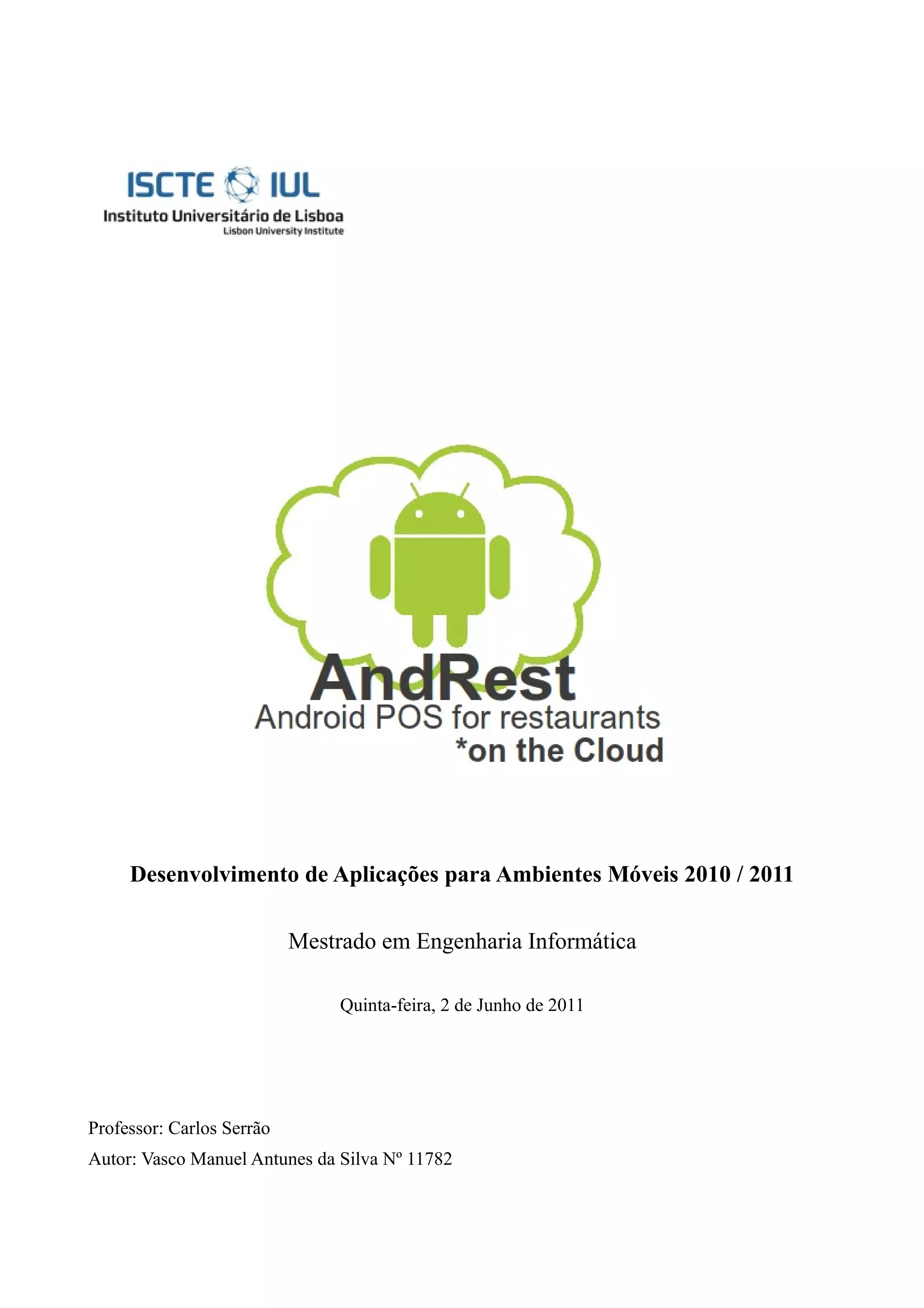 Este documento apresenta o desenvolvimento de uma aplicação móvel para sistemas de ponto de venda (POS) direcionados a bares e restaurantes. A aplicação permite a gestão de pedidos, pagamentos, mesas e produtos de forma flexível em dispositivos móveis Android. Requisitos funcionais incluem a abertura e fecho de mesas, adição de produtos, pagamentos parciais ou totais, e configuração de preços e horários. A arquitetura cliente-servidor usa web services para comunicação e permite implementações tradicionais ou
