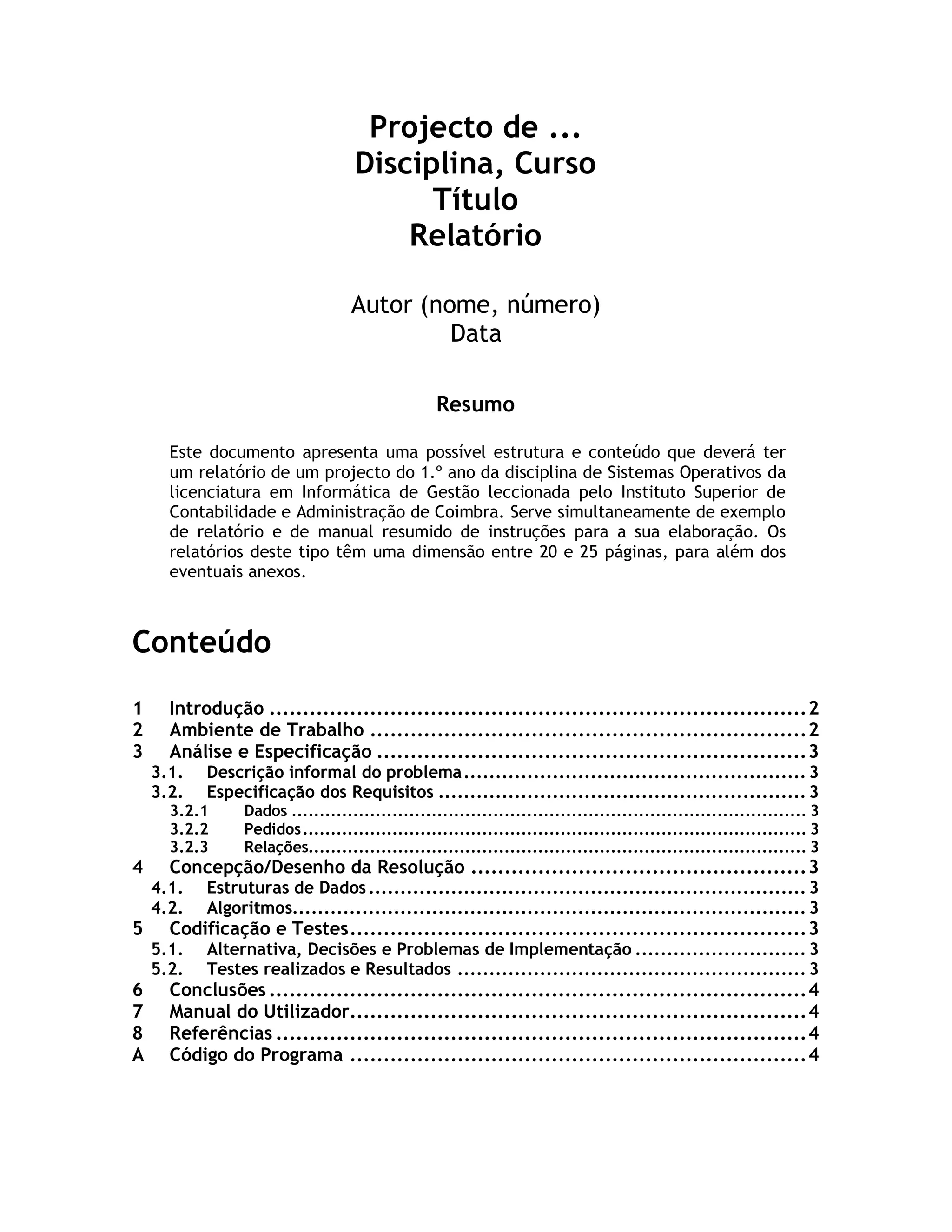 Este documento fornece uma estrutura modelo para relatórios de projetos da disciplina de Sistemas Operativos. Após a introdução, descreve o ambiente de trabalho, especifica e analisa o problema, propõe uma solução com estruturas de dados e algoritmos, detalha a codificação e testes, e conclui com um manual do utilizador e referências.