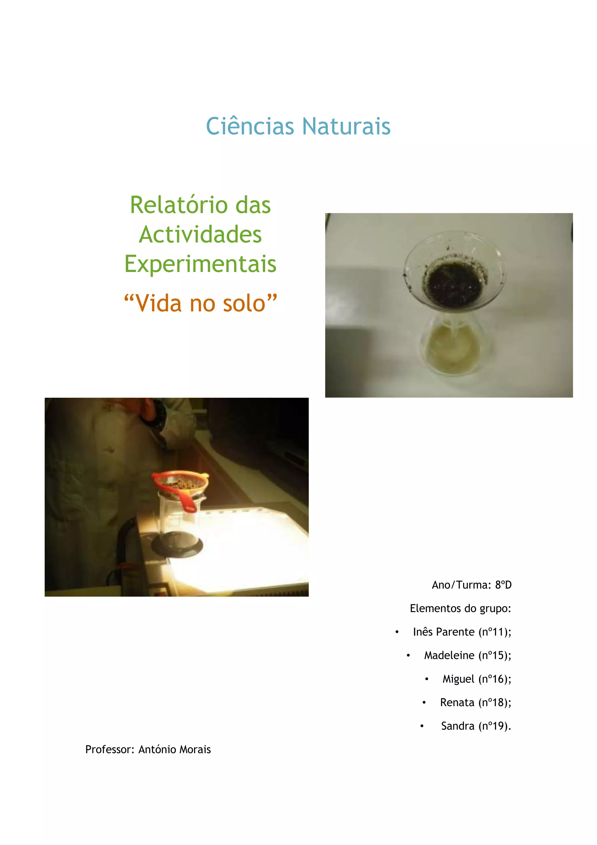 Os alunos realizaram experiências para observar a vida no solo. Eles coletaram amostras de solo rico em matéria orgânica e observou-as com uma lupa, não encontrando nenhum ser vivo. Usando um coador, encontraram um escaravelho e dois centípedes. Em um balão de Erlenmeyer, tentaram observar ácaros sob microscópio, mas tiveram dificuldade em identificá-los devido à grande diversidade de espécies.