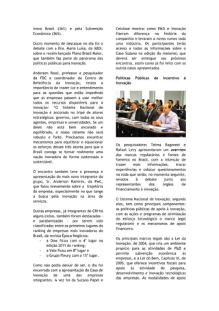 O documento descreve um encontro do Centro de Referência em Inovação (CRI) no qual representantes de empresas e órgãos governamentais que apoiam a inovação discutiram os desafios relacionados a incentivos e financiamentos para inovação no Brasil. Representantes do BNDES, FINEP, MCTI e FAPESP apresentaram projetos e linhas de fomento e debateram com as empresas sobre os principais desafios para acessar esse tipo de crédito.