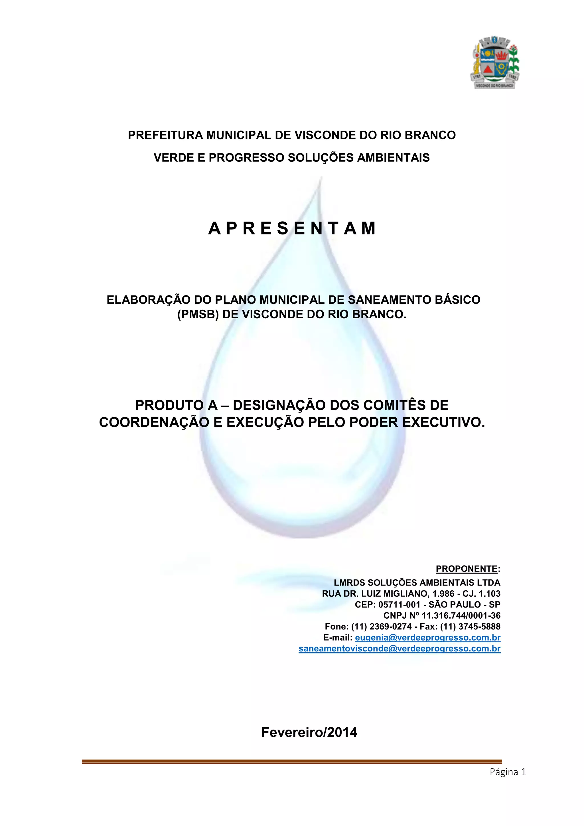 Este documento descreve a criação de comitês para coordenar a elaboração do Plano Municipal de Saneamento Básico de Visconde do Rio Branco. Foi criado o Comitê de Coordenação, responsável pela política pública de saneamento e coordenação do plano, e o Comitê Executivo, responsável pela operacionalização do processo de elaboração do plano. Os decretos no 115/2013 e 009/2014 designam os membros dos comitês e definem suas atribuições.
