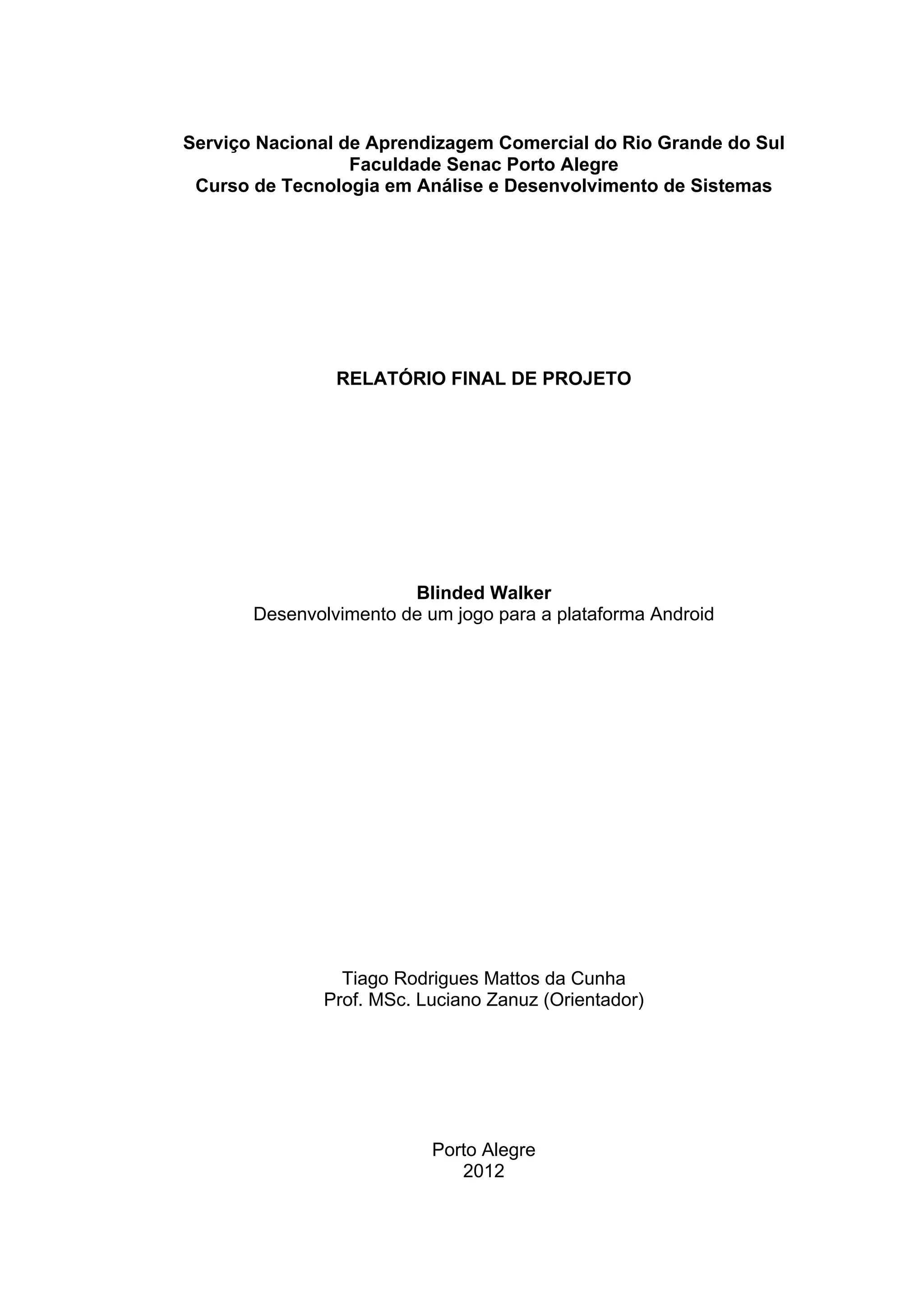Este relatório descreve o desenvolvimento de um jogo para Android chamado "Blinded Walker". O jogo envolve um personagem que deve navegar por níveis evitando obstáculos enquanto é guiado por sons. O relatório detalha os desafios técnicos enfrentados como renderização gráfica, animação, entrada do usuário, colisão e áudio. O projeto fornece soluções para problemas comuns no desenvolvimento de jogos para Android.