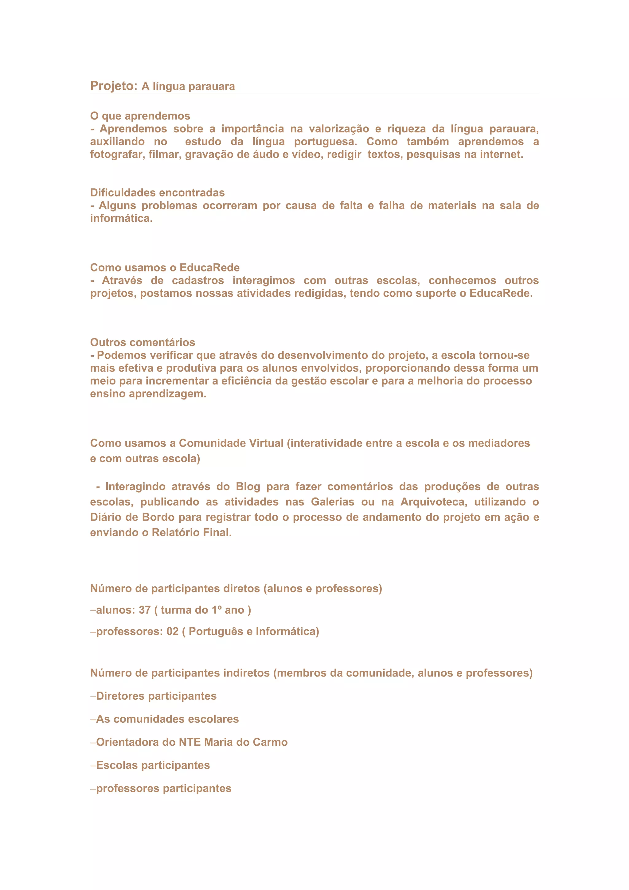 O projeto ensinou sobre a importância da língua Parauara e como usar ferramentas digitais para documentar a língua. Problemas com equipamentos causaram dificuldades. O EducaRede permitiu interagir com outras escolas e projetos. O projeto melhorou o ensino e aprendizagem na escola.