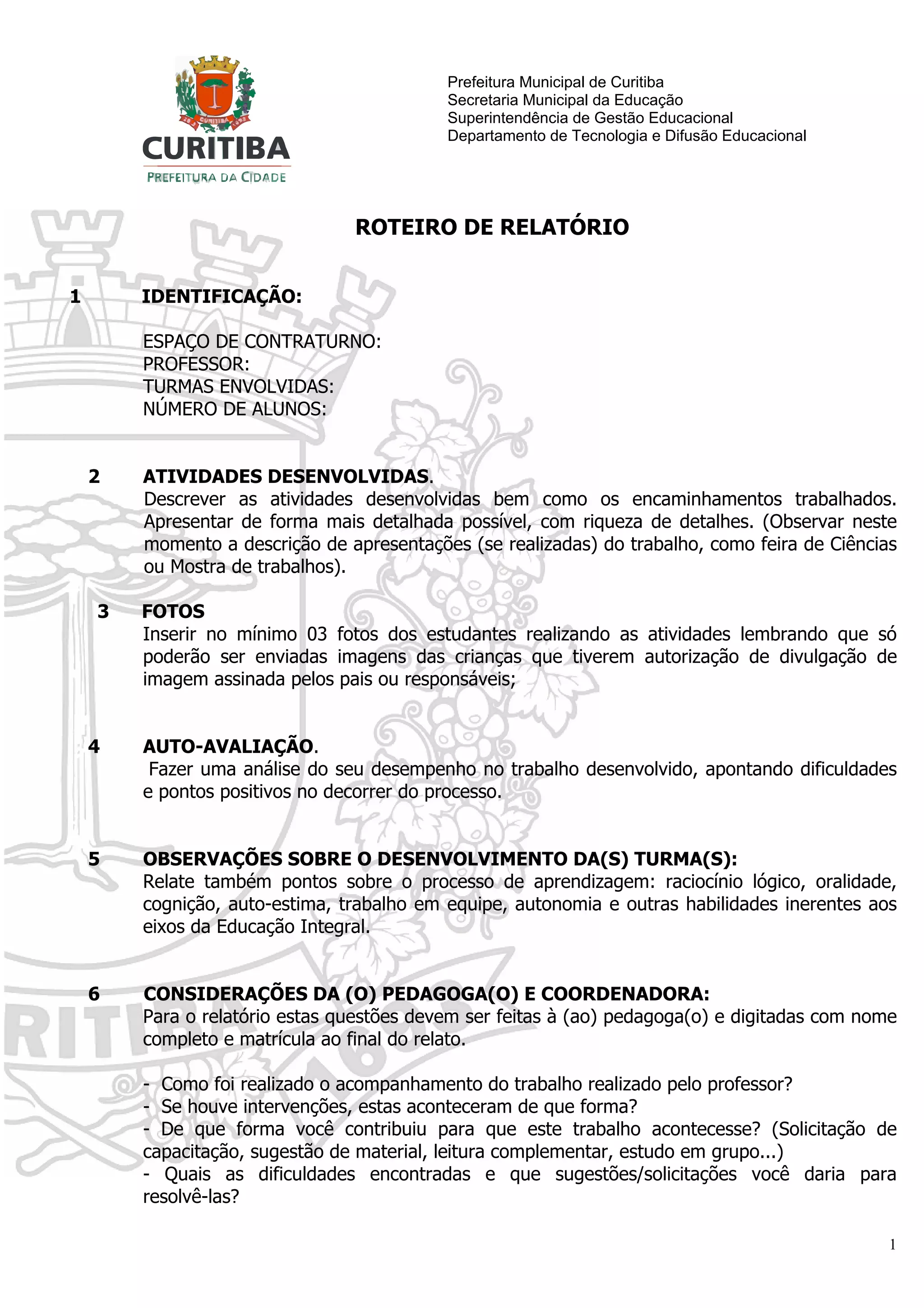 Este documento fornece um modelo de relatório para professores descreverem as atividades realizadas em espaços de contraturno, incluindo fotos e avaliações das atividades, alunos e processo de aprendizagem. Deve conter detalhes sobre as atividades, no mínimo 3 fotos dos alunos (com autorização dos pais), autoavaliação do professor e observações do coordenador sobre o desenvolvimento das turmas.