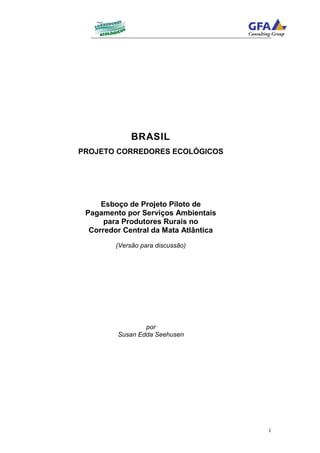 Este documento propõe um projeto piloto de pagamento por serviços ambientais (PSA) para produtores rurais no Corredor Central da Mata Atlântica na Bahia. O objetivo é remunerar atividades sustentáveis de conservação da biodiversidade e proteção dos recursos hídricos. O projeto selecionaria áreas prioritárias para receber pagamentos em troca desses serviços ambientais, e estimaria valores de pagamento com base nos benefícios econômicos dos serviços. Se bem-sucedido, o projeto poderia subsidiar