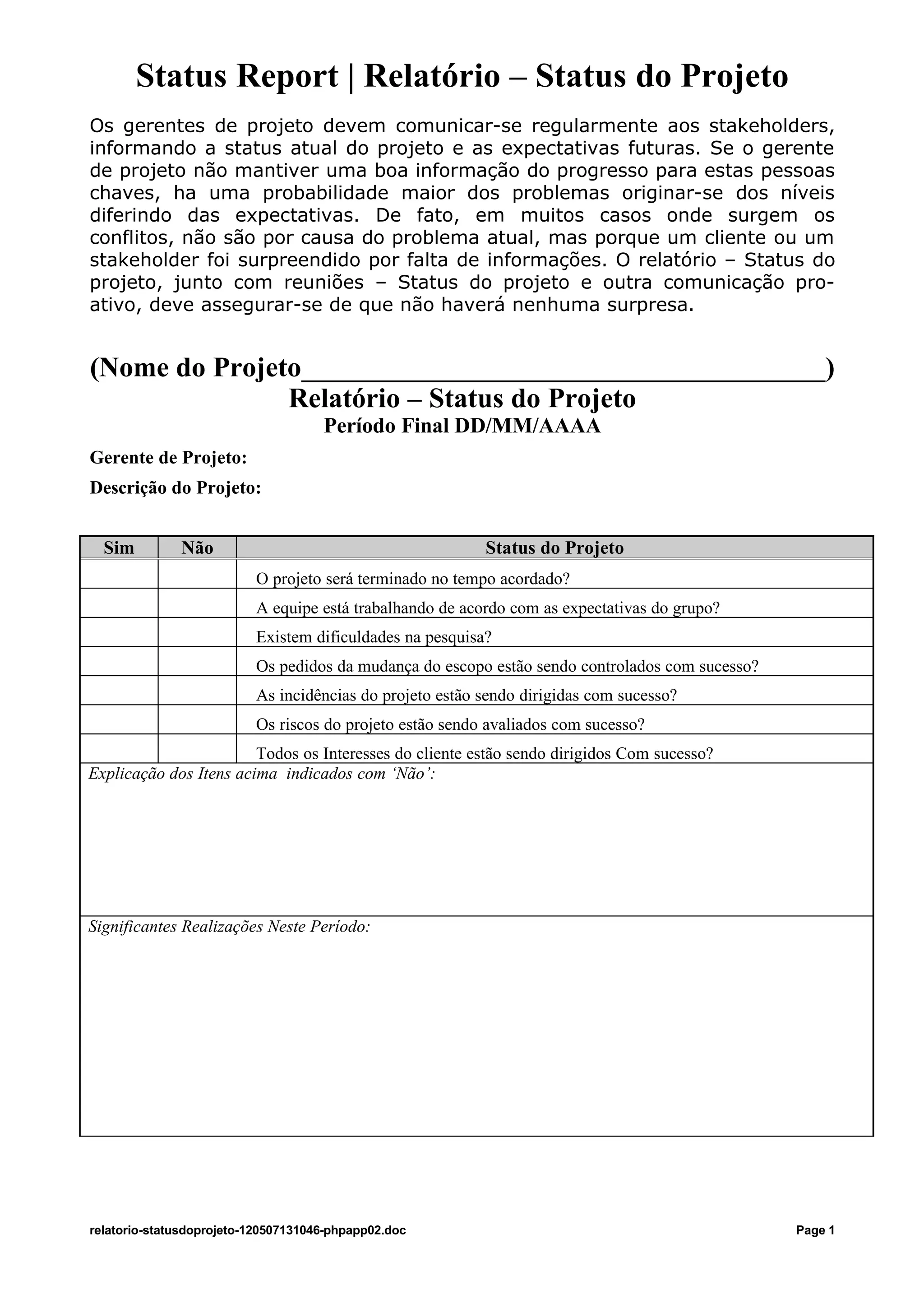 Os gerentes de projeto devem se comunicar regularmente com os stakeholders para informar o status atual e as expectativas futuras do projeto. Sem essa comunicação, há maior probabilidade de problemas surgirem devido a expectativas discrepantes. O relatório de status do projeto, junto com reuniões de status e outras comunicações proativas, deve assegurar que não haverá surpresas.