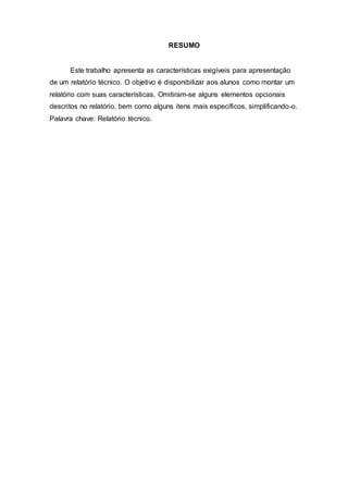 Este documento fornece instruções sobre como escrever um relatório técnico, definindo-o como uma exposição escrita de fatos e dados direcionados a alguém sobre um assunto ou questão. Ele descreve a estrutura de um relatório técnico, incluindo a parte inicial, corpo e anexos, e fornece exemplos dos tipos de relatórios.