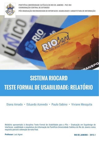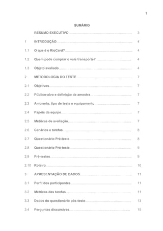 O documento aborda um estudo de usabilidade do sistema Riocard, destacando a experiência do usuário na realização de tarefas relacionadas ao vale-transporte eletrônico do Rio de Janeiro. Os testes identificaram problemas de usabilidade, como a confusão na nomenclatura e dificuldades de navegação, resultando em recomendações para melhorar a arquitetura de informação e a clareza do site. O estudo utilizou uma combinação de pré-testes e testes de usabilidade, colhendo feedbacks dos participantes sobre suas experiências no portal.