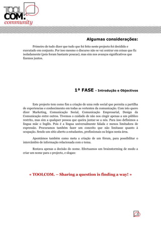 Este relatório descreve o projeto de criação de uma rede social chamada TOOLCOM para compartilhar experiências e conhecimento sobre comunicação. O projeto envolveu escolher plataformas gratuitas, estruturar fóruns e categorias, personalizar a aparência do site, otimizar o SEO e divulgar a rede social.