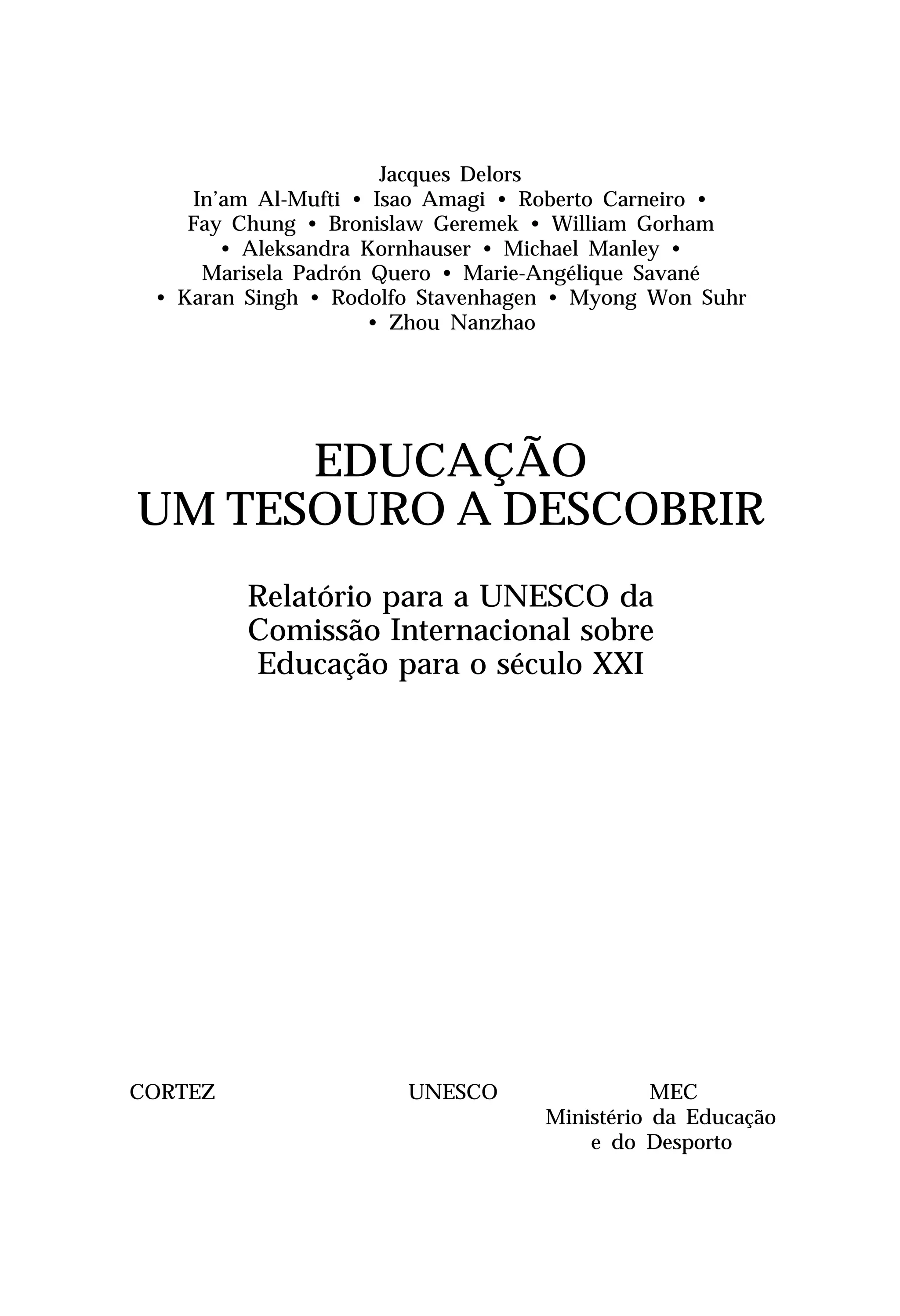 Este documento apresenta o relatório da Comissão Internacional sobre Educação para o século XXI da UNESCO. O relatório discute os desafios globais da educação e propõe quatro pilares para a educação: aprender a conhecer, aprender a fazer, aprender a viver juntos e aprender a ser. O relatório enfatiza a importância da educação ao longo da vida para enfrentar um mundo em constante mudança.