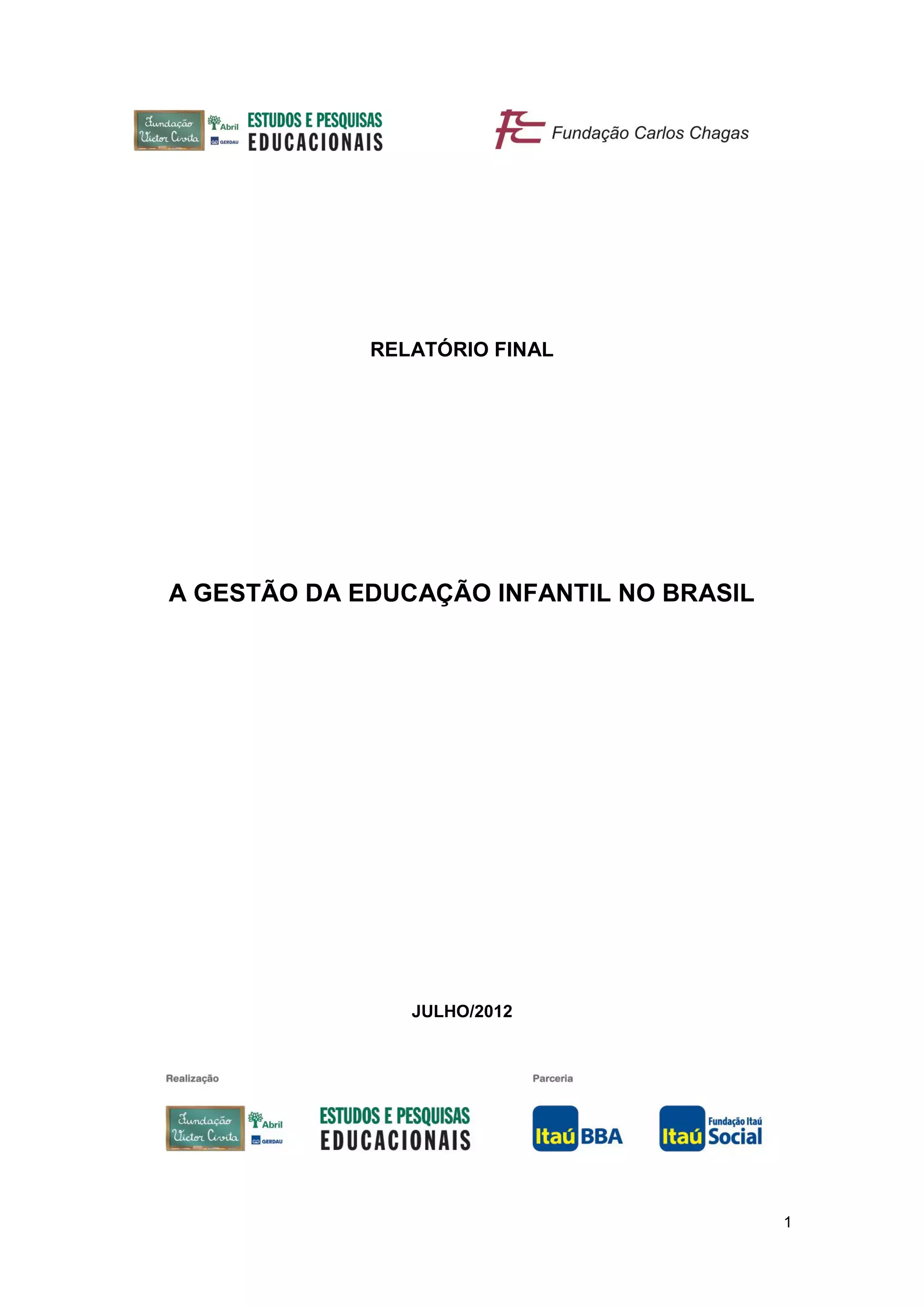 Este relatório apresenta os resultados de uma pesquisa sobre a gestão da Educação Infantil no Brasil, realizada por equipes da Fundação Victor Civita e da Fundação Carlos Chagas. O documento discute a cobertura e a qualidade da Educação Infantil nos municípios pesquisados, analisa aspectos da gestão municipal e das instituições, e traz depoimentos de professores e coordenadores. O relatório oferece subsídios para o aprimoramento das políticas públicas da Educação Infantil.