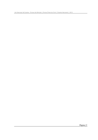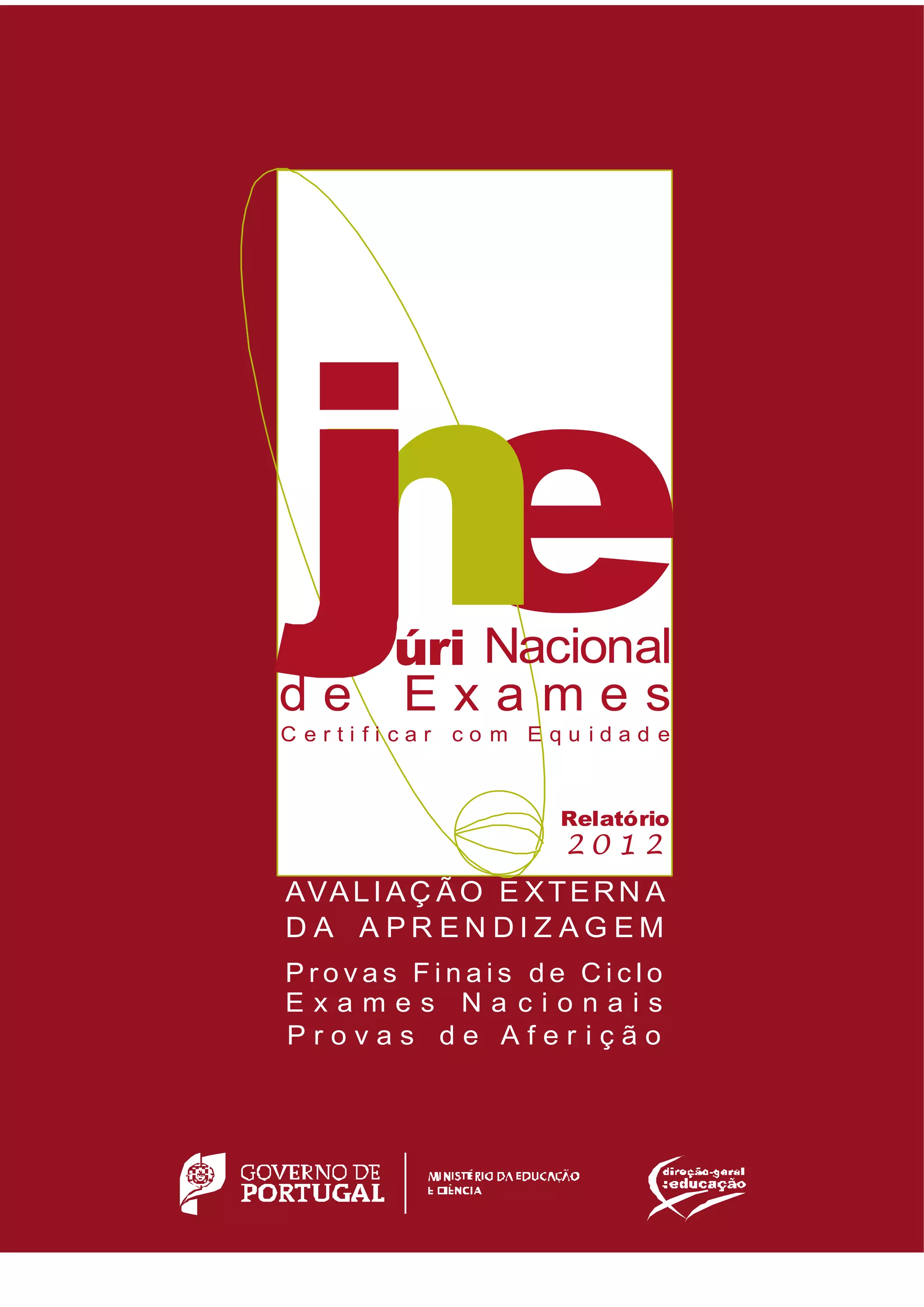 Este documento apresenta o relatório de 2012 do Júri Nacional de Exames sobre o processo de avaliação externa da aprendizagem em Portugal, incluindo as provas de aferição do 1o ciclo, as provas finais dos 2o e 3o ciclos e os exames nacionais do ensino secundário. Descreve a estrutura e competências do Júri Nacional de Exames, os principais aspetos do planeamento e funcionamento dos processos de avaliação e apresenta estatísticas sobre os resultados obtidos.