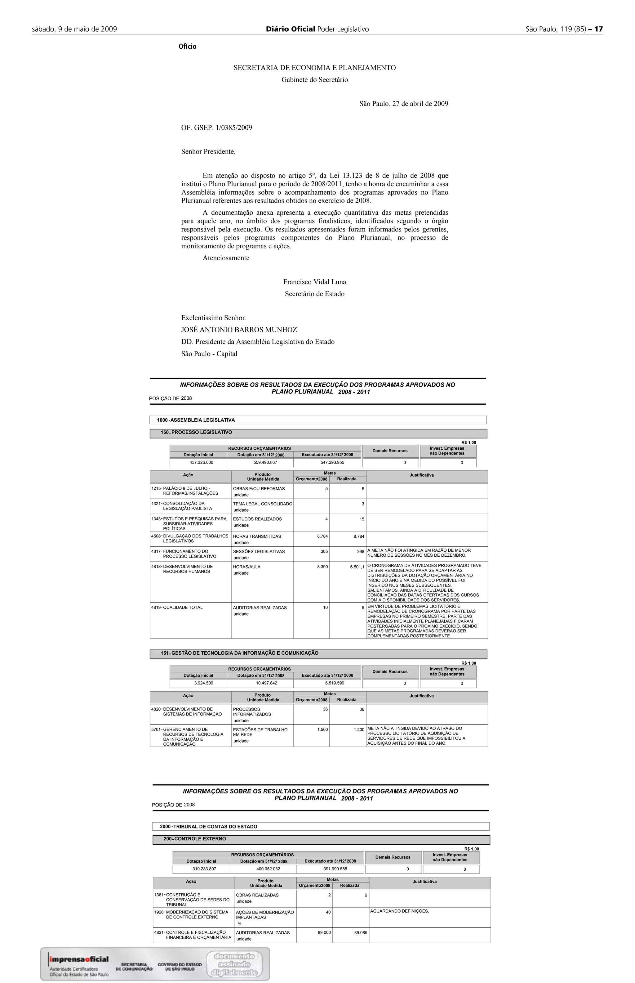 O documento apresenta informações sobre os resultados da execução dos programas aprovados no Plano Plurianual de 2008 a 2011. Fornece detalhes como metas planejadas, orçamentos, resultados alcançados e justificativas para eventuais desvios nas metas de vários órgãos do governo do estado de São Paulo no ano de 2008.