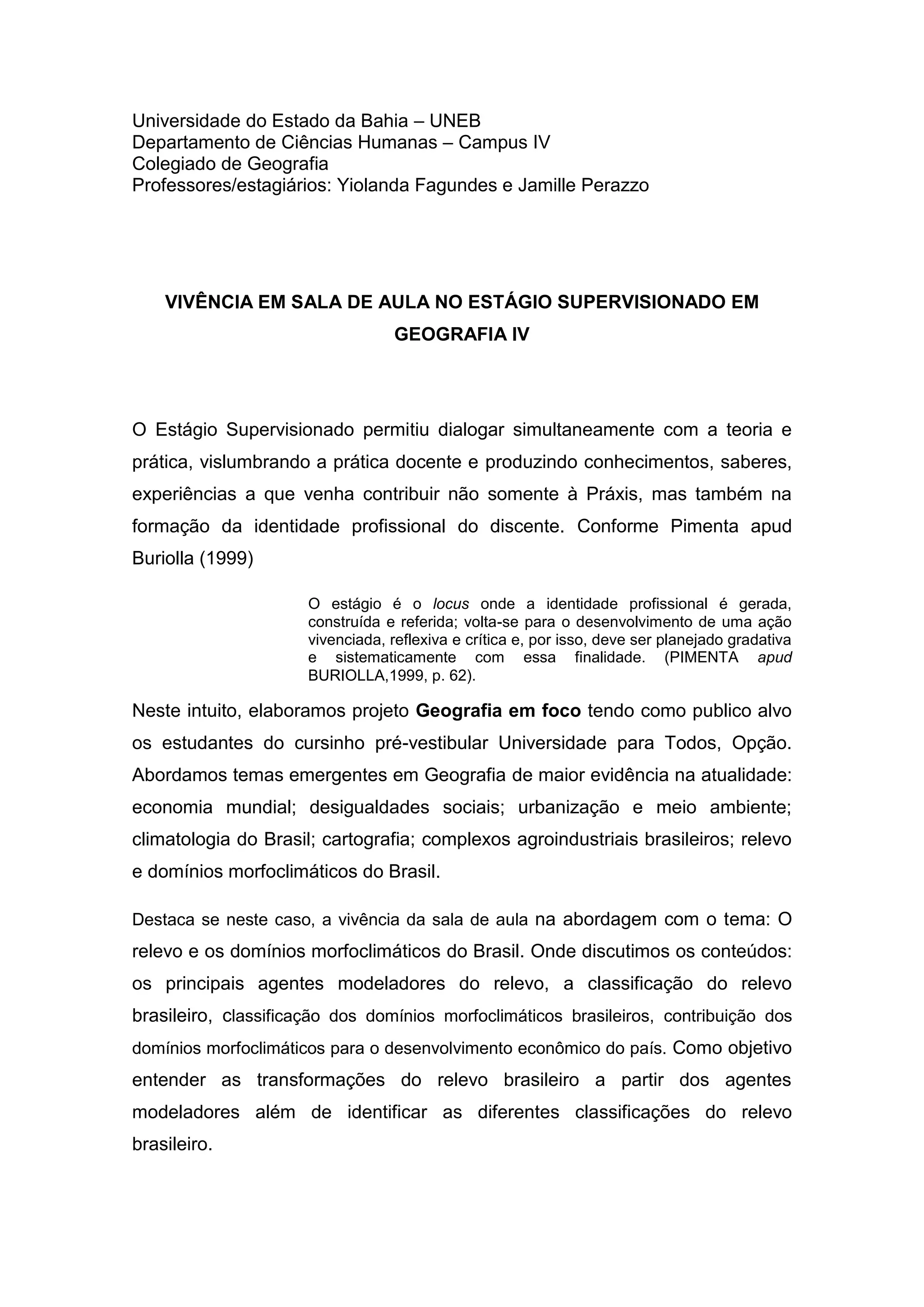 O documento descreve a experiência de estágio supervisionado em geografia de dois professores estagiários. Eles desenvolveram um projeto sobre temas emergentes em geografia para alunos de cursinho pré-vestibular. Uma das aulas abordou o relevo e domínios morfoclimáticos do Brasil com o objetivo de entender as transformações do relevo brasileiro e identificar as classificações do relevo e domínios. Os alunos participaram de atividades e discussões sobre o assunto. A experiência contribuiu para o aper