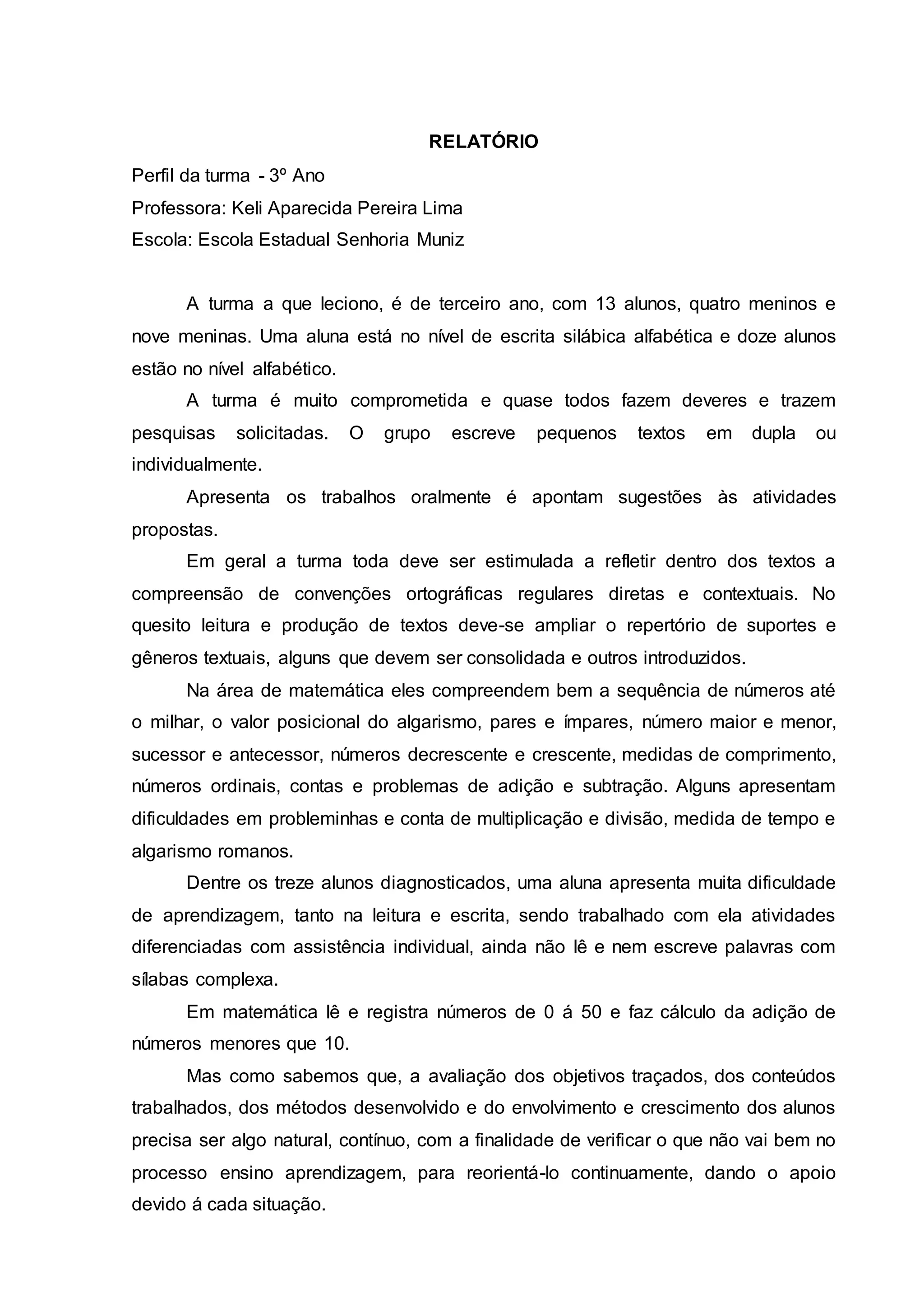O documento descreve uma turma de terceiro ano com 13 alunos. A maioria está no nível alfabético de escrita, exceto uma aluna no nível silábico. A turma se empenha nos deveres de casa e apresentações. Eles precisam ser estimulados a refletir sobre ortografia e ampliar seus gêneros textuais. Uma aluna tem grandes dificuldades de aprendizagem em leitura, escrita e matemática.