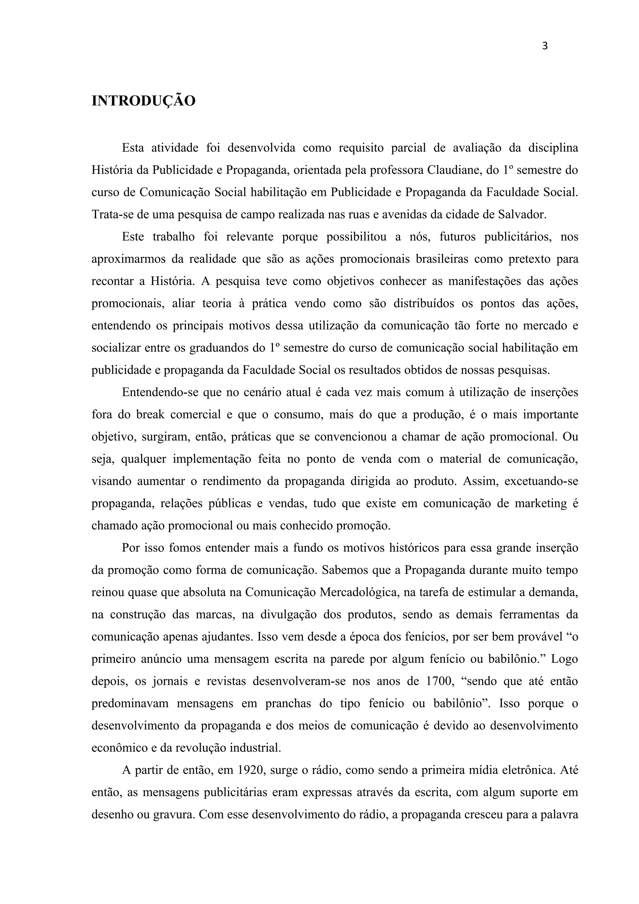 O documento discute a evolução das ações promocionais no Brasil, destacando como elas se tornaram fundamentais no contexto da comunicação mercadológica moderna. A pesquisa realizada em Salvador busca entender as manifestações dessas ações, que historicamente complementam a propaganda e se adaptam às necessidades do consumidor contemporâneo. Além disso, o texto enfatiza a integração entre propaganda e promoção como essencial para o sucesso nas estratégias de comunicação das empresas.