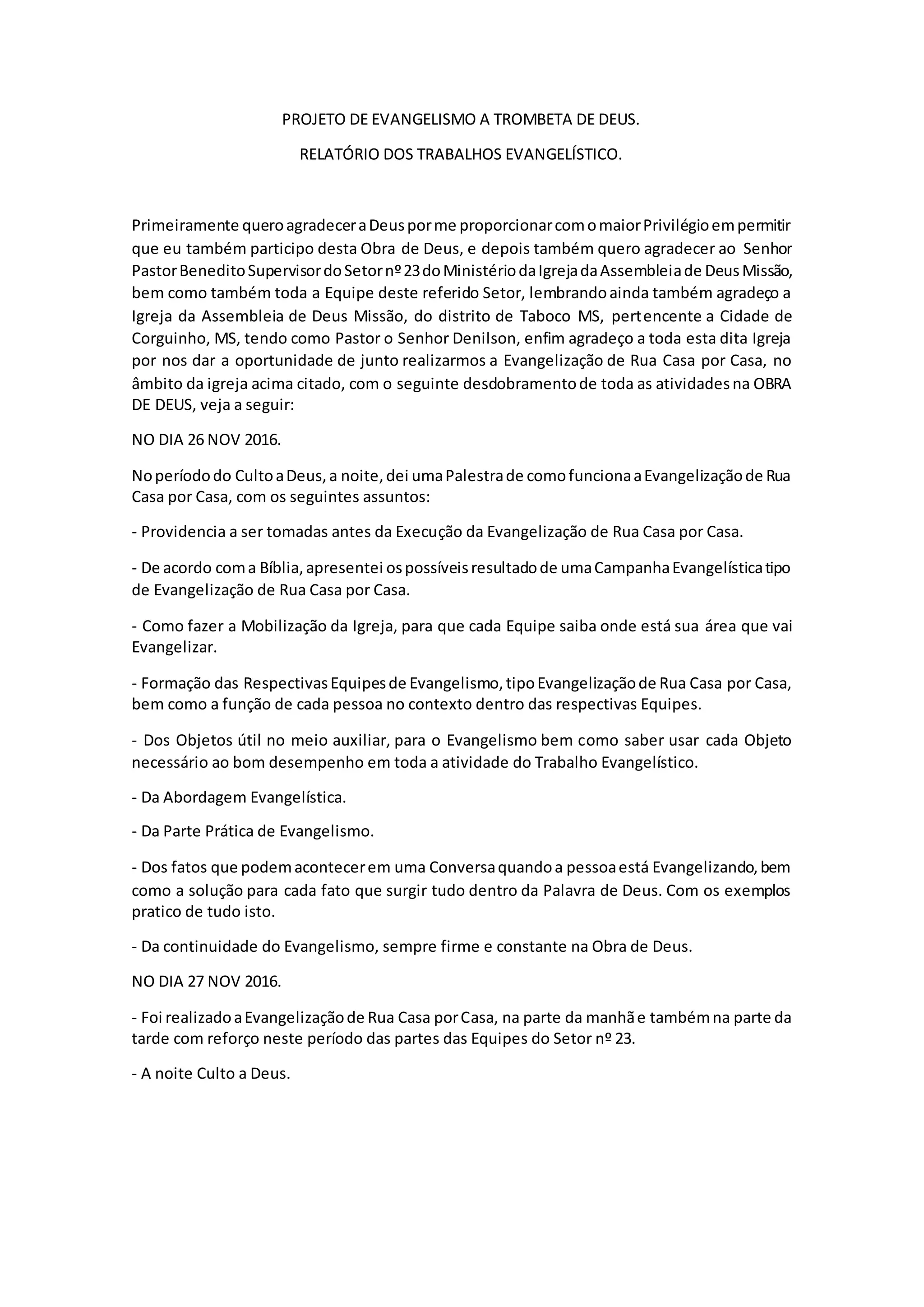 O relatório descreve as atividades de evangelismo realizadas pela Igreja Assembleia de Deus Missão em Taboco, MS. O trabalho incluiu palestras sobre evangelismo, visitas de casa em casa e cultos noturnos. Como resultado, várias pessoas expressaram interesse em aprender mais sobre Cristo e cinco aceitaram Jesus como seu salvador. O relatório destaca a necessidade de união entre as igrejas evangélicas locais para combater as forças espirituais negativas na região.