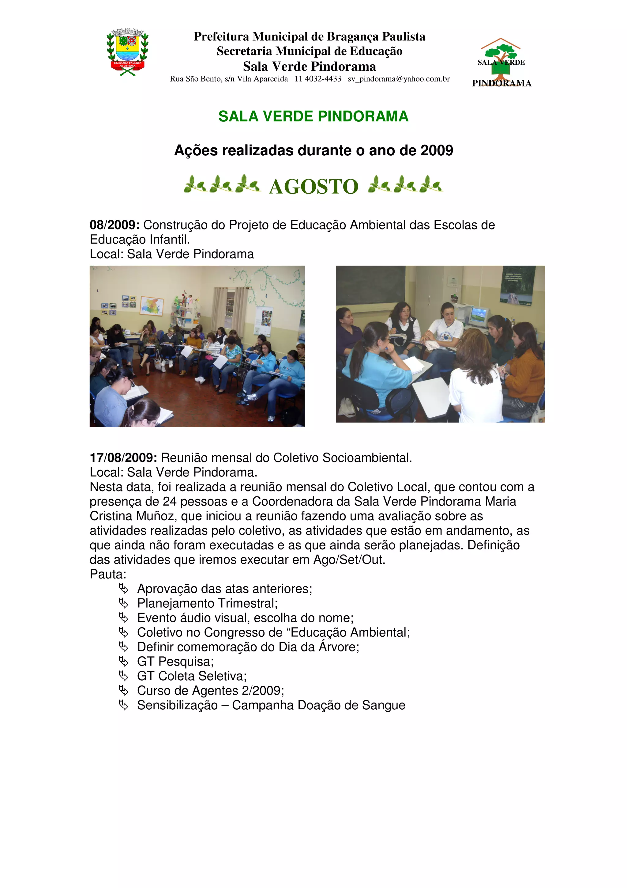 O documento resume as ações realizadas pela Sala Verde Pindorama em agosto de 2009, incluindo a construção de um projeto de educação ambiental para escolas de educação infantil, reuniões do coletivo socioambiental local e participações em eventos sobre gestão de recursos hídricos e sustentabilidade socioambiental.