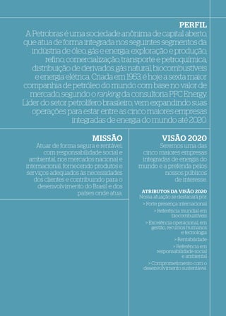 O relatório anual da Petrobras descreve suas operações em exploração e produção de petróleo e gás, refino, transporte, distribuição e energia elétrica. A empresa expandiu suas operações internacionais e visa ser uma das cinco maiores empresas integradas de energia do mundo até 2020, com forte presença internacional e referência em biocombustíveis e responsabilidade social e ambiental. Os principais indicadores mostram que a produção e reservas se mantiveram estáveis entre 2006-2007, enquanto a receita aumentou, porém o lucro líqu