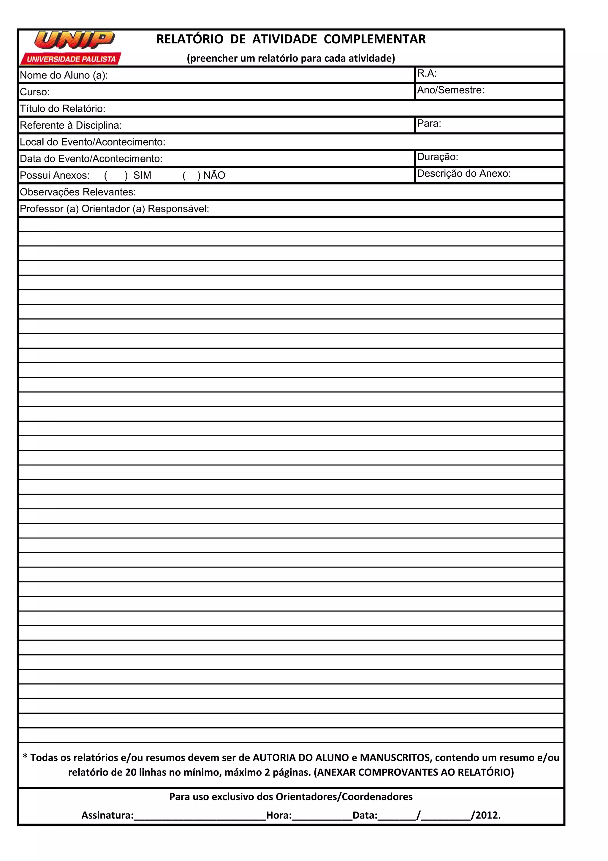 Este relatório pede informações sobre uma atividade complementar realizada por um aluno, incluindo o nome do aluno, curso, título do evento, data, local, observações relevantes e assinatura do professor orientador. O relatório deve conter detalhes da atividade em pelo menos 20 linhas escritas pelo aluno.