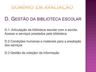 O relatório apresenta os resultados de um questionário aplicado a alunos e professores sobre a Biblioteca Escolar. A Biblioteca tem boas condições e integração na escola, mas carece de recursos digitais e formação para a equipa para melhor servir as necessidades dos utilizadores. Recomenda-se investir na digitalização, formação e articulação com os departamentos para maximizar o impacto da Biblioteca.