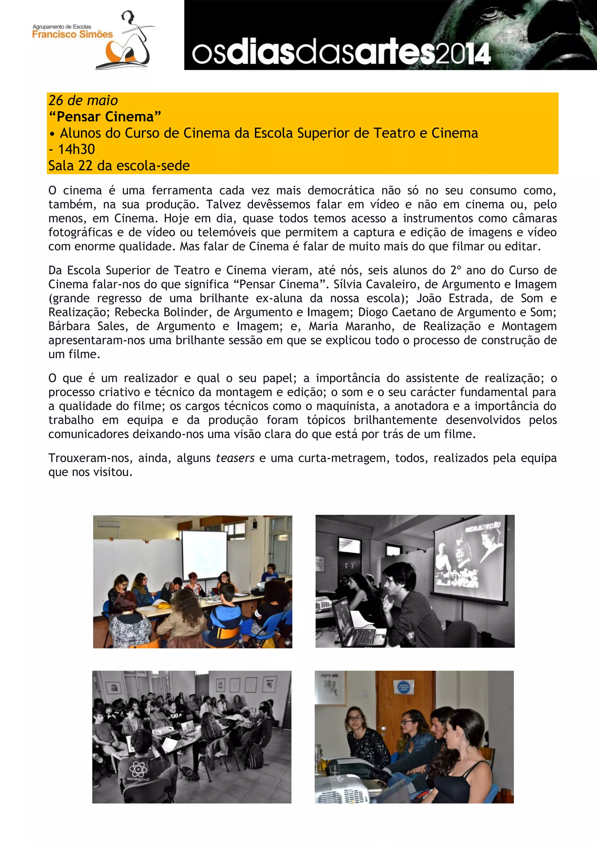 Este documento resume uma palestra dada por seis alunos do Curso de Cinema da Escola Superior de Teatro e Cinema sobre o processo de criação de um filme. Os alunos explicaram os papéis do realizador, assistente de realização e montagem, a importância do som e do trabalho em equipe, e apresentaram teasers e uma curta-metragem como exemplos.
