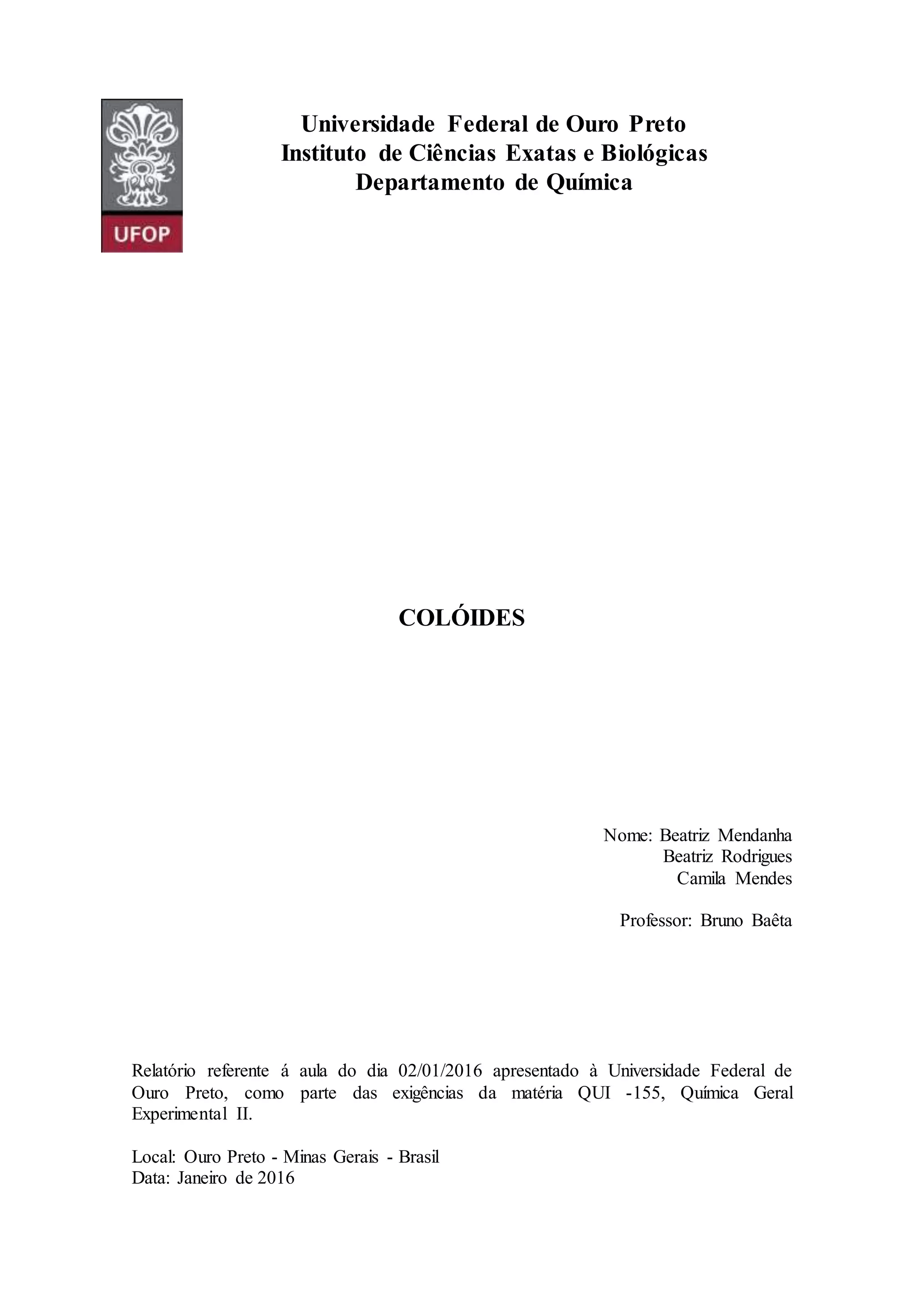 1) O documento apresenta um relatório sobre um experimento sobre colóides realizado por alunas da Universidade Federal de Ouro Preto. 2) O experimento envolveu a preparação de uma solução coloidal de hidróxido férrico e testes de estabilidade com diferentes eletrólitos. 3) Os resultados mostraram que eletrólitos com maior carga iônica causaram maior turvação da solução, indicando maior formação de colóides.