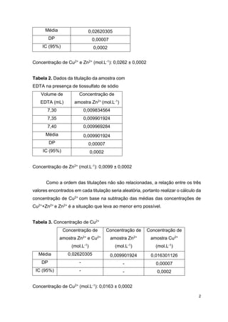 Este documento descreve um experimento de complexometria para determinar os teores de cobre e zinco em uma amostra de latão. Foram realizadas duas titulações: na primeira, determinaram-se as concentrações de Cu2+ e Zn2+ juntos, e na segunda, apenas Zn2+ após adição de tiossulfato de sódio para mascarar o Cu2+. Isso permitiu calcular separadamente cada concentração e a porcentagem de cada metal na amostra, que foram de 41,07% de Zn e 65,72% de Cu.