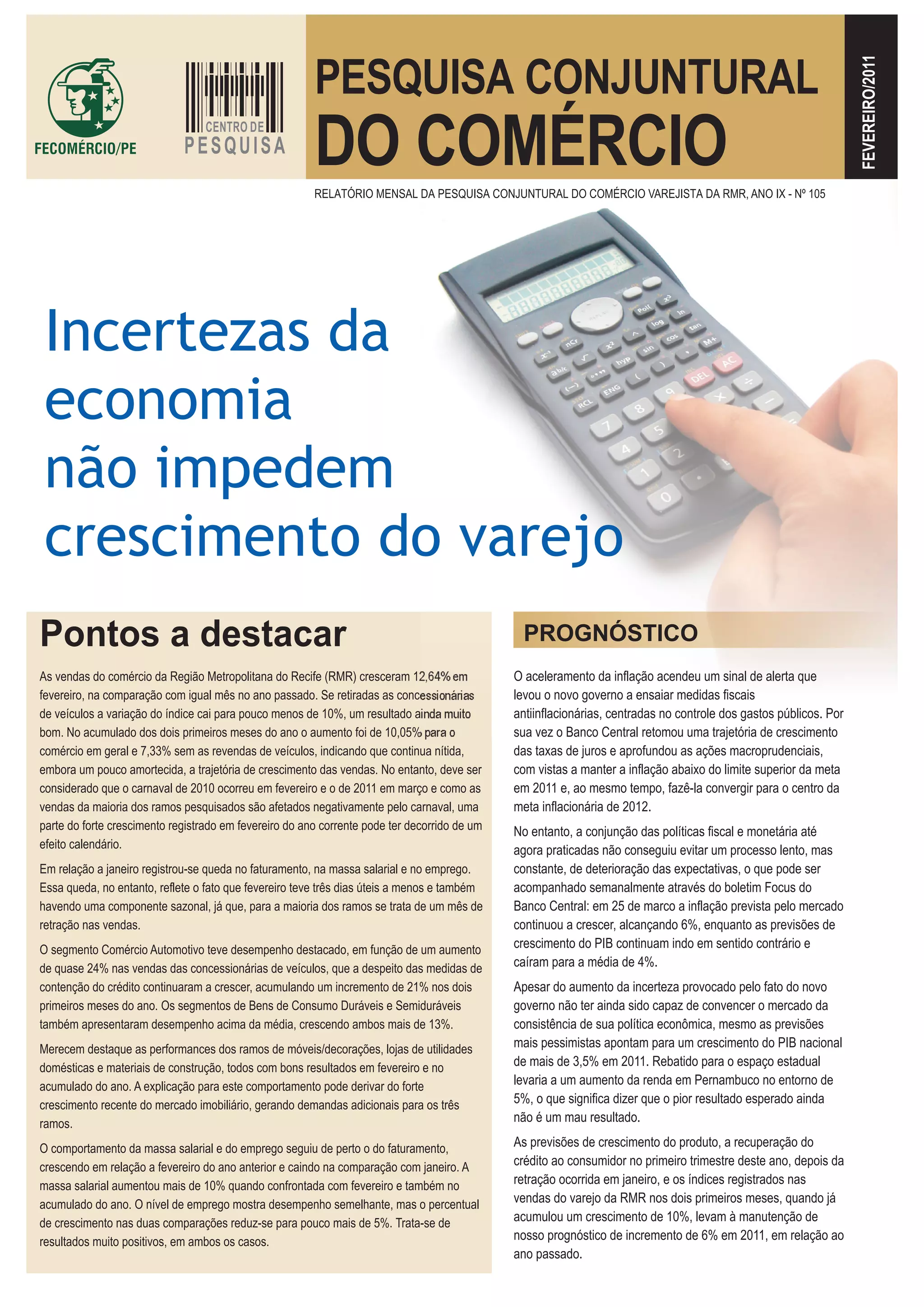 1) As vendas do comércio varejista da Região Metropolitana do Recife cresceram 12,64% em fevereiro de 2011 na comparação com o mesmo mês de 2010.