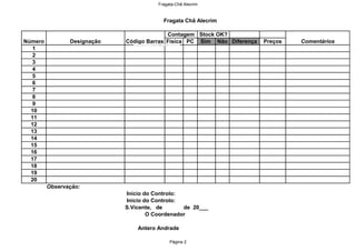 O documento lista os produtos de álcool e seus respectivos estoques em uma loja. Há pequenas diferenças entre os números físicos e no sistema para alguns itens. O controle de estoque foi realizado em 11 de março de 2013 e assinado pelo coordenador Antero Andrade.