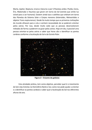 O documento descreve um relatório experimental sobre orientação pelo sol e estrelas nos hemisférios norte e sul. Ele explica que no hemisfério norte, o sol se move de leste a oeste durante o dia e as estrelas giram em torno da estrela polar à noite, enquanto no hemisfério sul, o sol se move de oeste a leste durante o dia e as estrelas giram em torno da Cruz do Sul à noite. Ele também discute como as estações do ano afetam a altura aparente do sol em cada hemisfério.