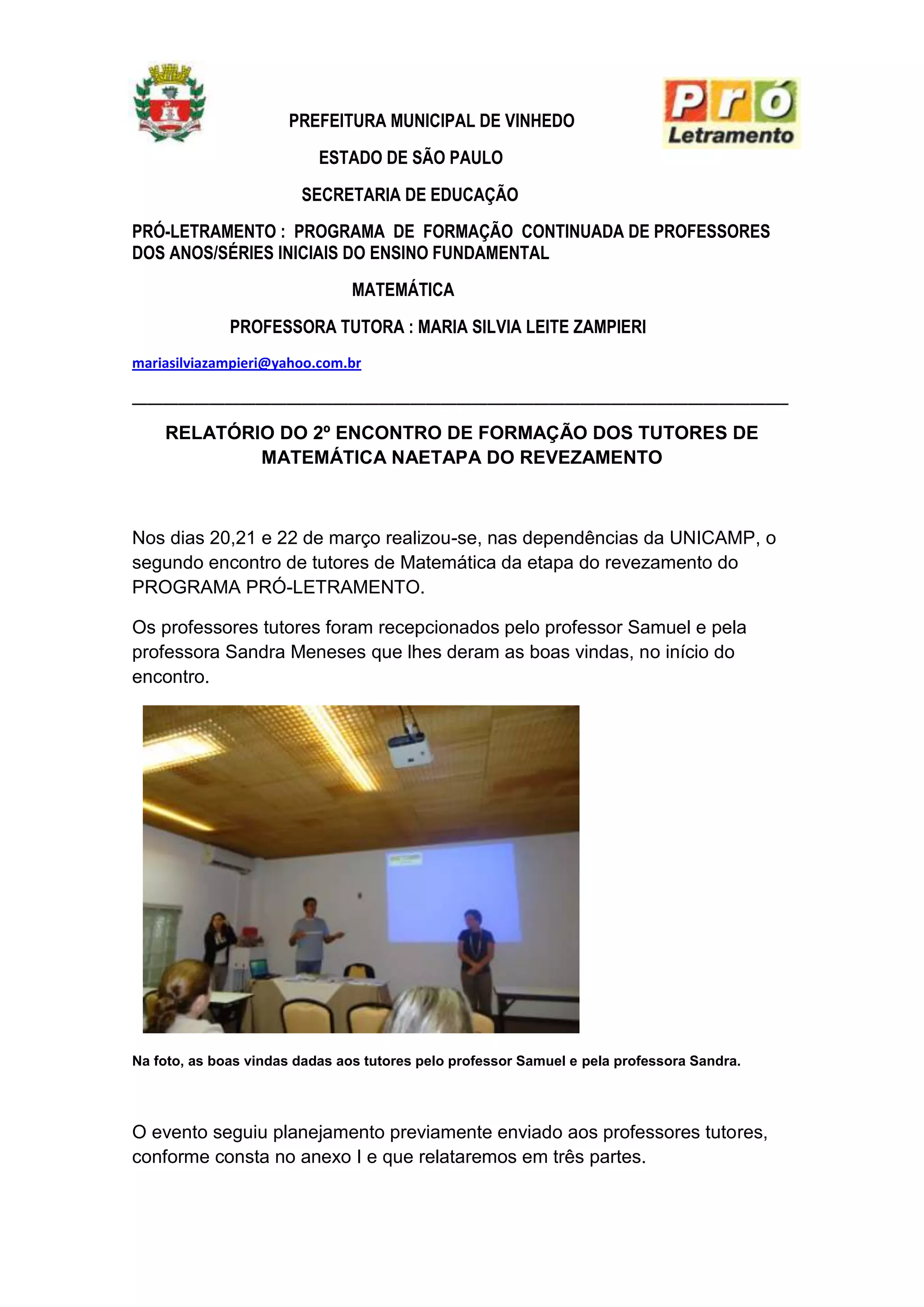 O documento resume o segundo encontro de formação de professores tutores de matemática para o programa Pró-Letramento. O evento contou com aulas sobre cálculo mental, estimativas e geometria com programas computacionais. Os tutores aprenderam novas estratégias para ensinar esses tópicos aos alunos.