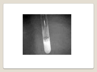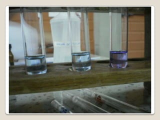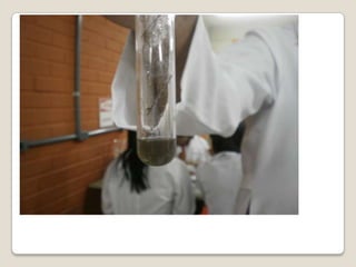 Este documento discute as propriedades químicas dos aminoácidos e proteínas. Ele descreve como os aminoácidos se unem para formar proteínas através de ligações peptídicas e como as células precisam de aminoácidos para produzir suas próprias proteínas. Ele também relata vários experimentos realizados, incluindo reações de Millon, Biureto e Ninhidrina para identificar aminoácidos específicos em amostras de proteínas e precipitação de proteínas usando ácidos e sais