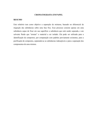 Este relatório descreve um experimento de cromatografia em papel realizado com tintas de pincel. O objetivo era separar as substâncias das misturas de tintas usando etanol e água como solventes móveis. As distâncias percorridas pelas substâncias foram medidas e usadas para calcular os fatores de retenção, que permitiram comparar a mobilidade relativa de cada substância na fase estacionária de papel.