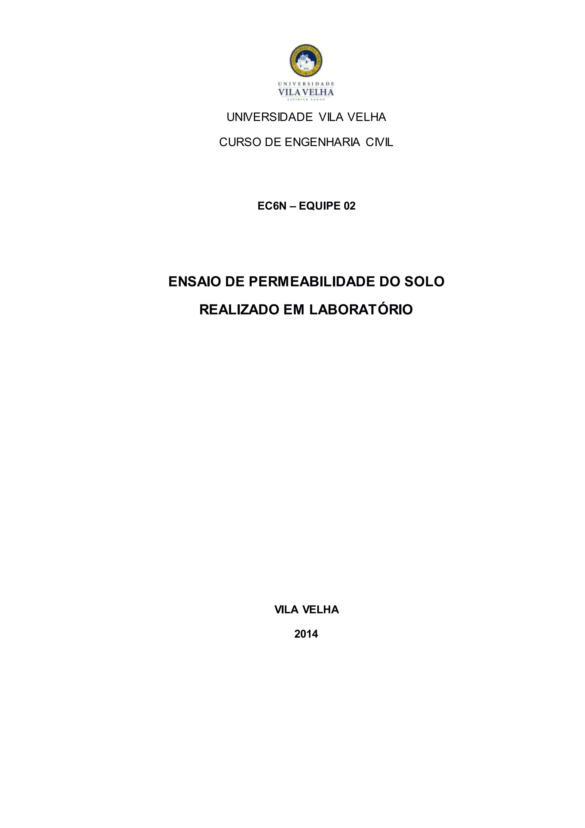 Este relatório descreve um ensaio de permeabilidade realizado em laboratório para determinar o coeficiente de permeabilidade de amostras de solo. O ensaio não pôde ser concluído com sucesso devido à falta de equipamentos necessários como bomba de vácuo para saturar as amostras. Sem os resultados reais, não foi possível calcular valores precisos para a permeabilidade.