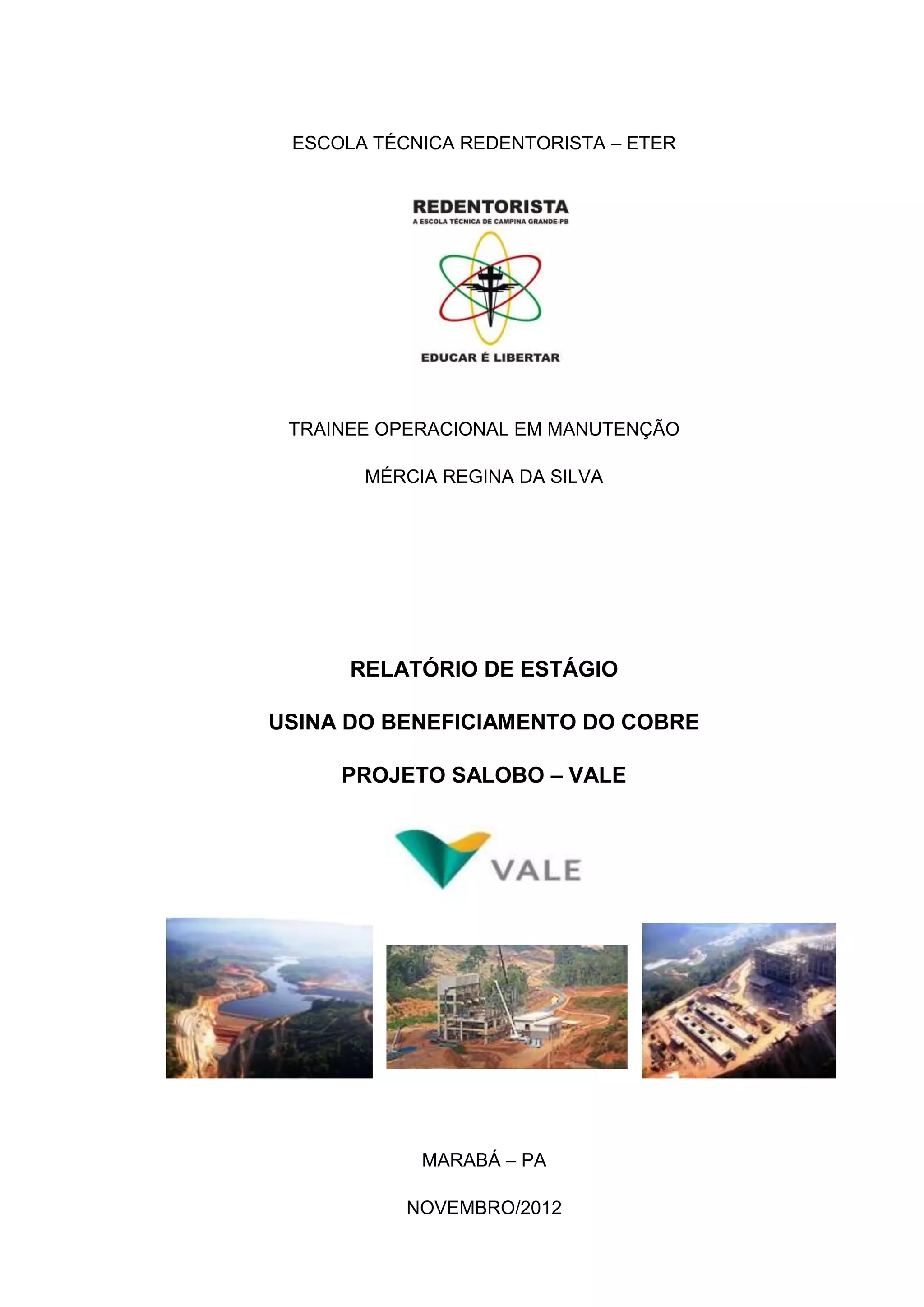 1. O documento apresenta um relatório de estágio realizado por Mércia Regina da Silva na Usina do Projeto Salobo da Vale. 2. O estágio ocorreu por oito meses na área de instrumentação industrial, realizando manutenção preventiva. 3. O relatório descreve o histórico da Vale, o processo produtivo da usina, as atividades desenvolvidas durante o estágio e os conhecimentos adquiridos na área de instrumentação.