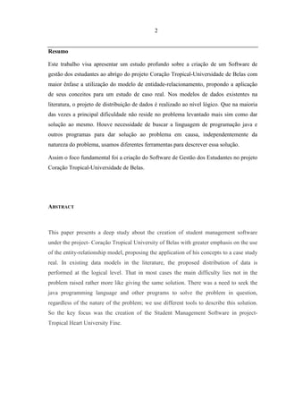 Este relatório descreve o desenvolvimento de um software de gestão de estudantes para o projeto Coração Tropical Universidade de Belas. O software foi criado usando Java e MySQL para armazenar dados de estudantes, cursos, inscrições e outras informações relevantes. O objetivo é agilizar a gestão de dados e permitir o acesso a informações de forma mais eficiente do que a folha de cálculo anteriormente usada. O relatório detalha os requisitos, modelo de dados, design do sistema e funcionalidades implementadas no software.