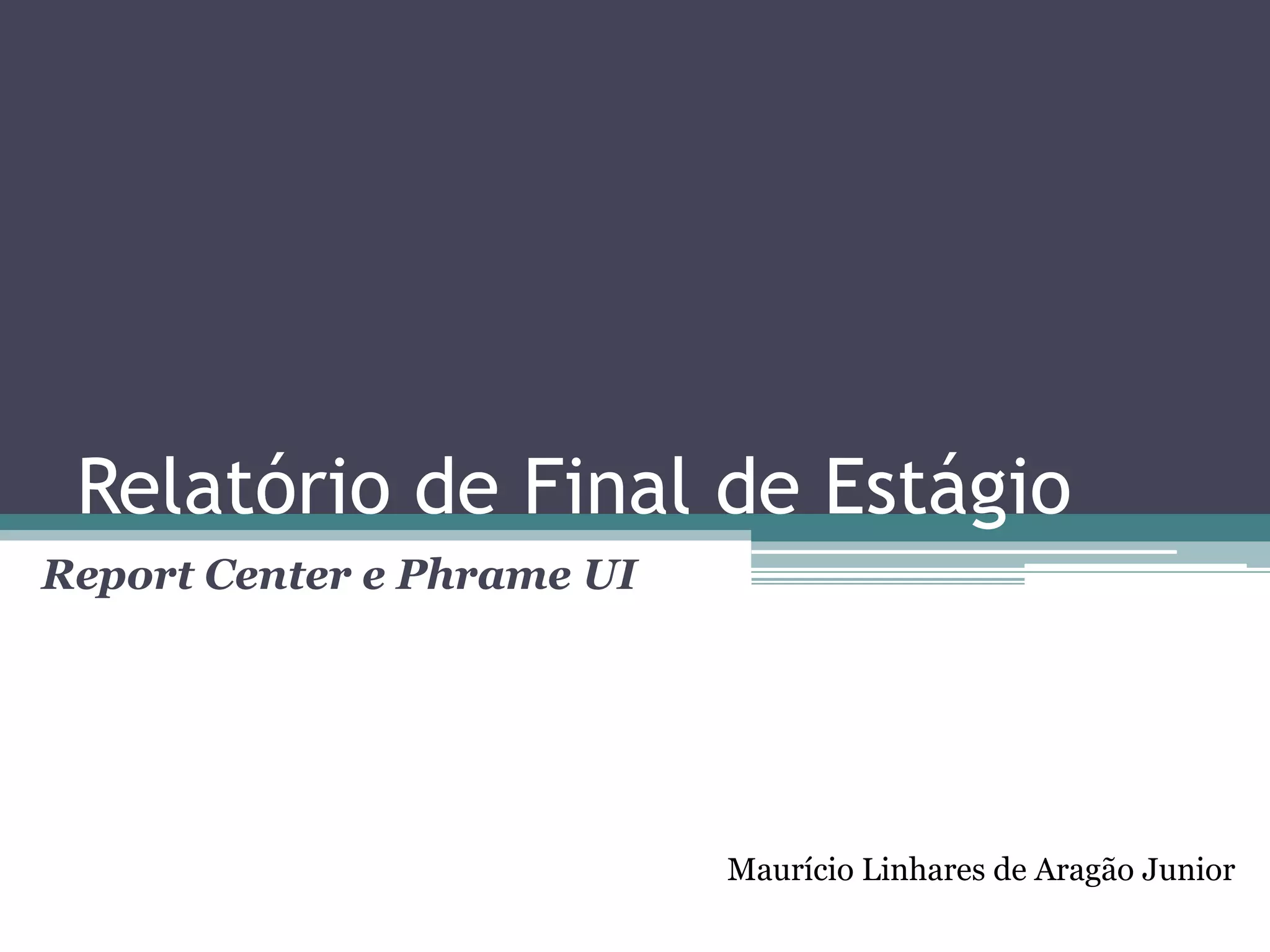 O relatório de estágio de Maurício Linhares de Aragão Júnior aborda a redefinição de padrões e a implementação de soluções tecnológicas em Java para a empresa Phoebus Tecnologia, incluindo arquitetura de sistemas, desenvolvimento do Report Center e do framework Phrame UI. Destaca-se o processo de desenvolvimento, que apresenta pontos positivos e negativos, como a forte base no RUP, mas com práticas ainda em definição. O documento também explora as necessidades e problemas do Report Center, além dos desafios e futuras implementações do Phrame UI.