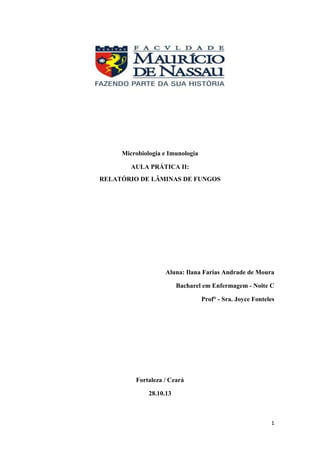 O documento descreve os resultados da observação de 4 lâminas de fungos sob microscópio, incluindo lâminas de conteúdo vaginal contendo leveduras, cultivo de fungos filamentosos, escama de pele contendo macroconídios e lâmina de Histoplasma capsulatum contendo hifas e microconídios. O objetivo era observar a diferença entre fungos leveduriformes e filamentosos e aprender técnicas de identificação.