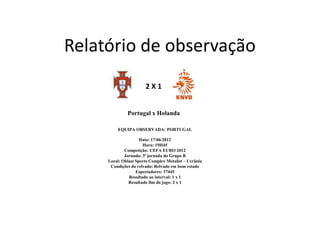 O relatório analisa o desempenho da equipe de Portugal em um jogo contra a Holanda na UEFA Euro 2012, destacando uma vitória por 2 a 1 após um empate no primeiro tempo. A equipe apresentou um sistema tático 4-3-3, com ênfase em transições rápidas e combinações ofensivas, especialmente utilizando seus extremos. O documento também discute as falhas defensivas e a importância das bolas paradas, além de caracterizar individualmente os jogadores mais destacados.