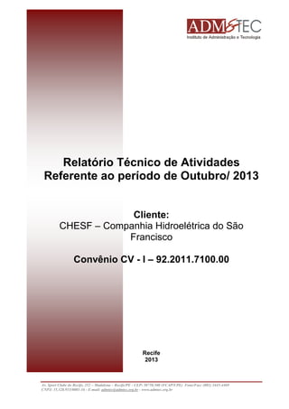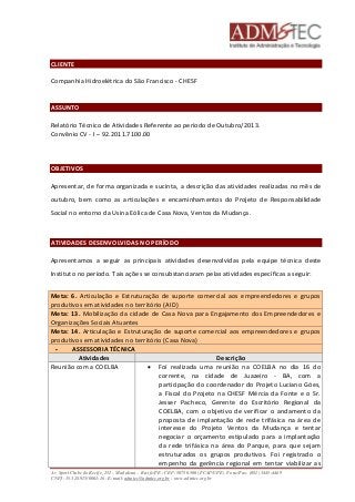 O relatório descreve as atividades realizadas em outubro de 2013 para o projeto de responsabilidade social Ventos da Mudança, incluindo reuniões com a COELBA e Embrapa para discutir infraestrutura elétrica e projetos hídricos, além de pesquisas sobre mel e mapeamento de propriedades interessadas em energia trifásica.