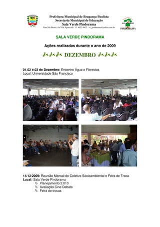 A Sala Verde Pindorama realizou várias ações em dezembro de 2009, incluindo encontros sobre água e florestas, reuniões mensais com o Coletivo Socioambiental e feiras de troca. Eles também avaliaram projetos de educação ambiental em escolas e o Projeto Semana da Água. A Sala Verde também produziu textos para uma coluna ambiental em um jornal local.
