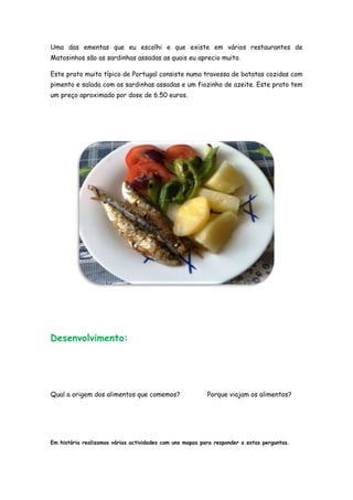 [1] O documento relata as atividades realizadas por uma turma de estudantes para responder ao desafio "Nós somos o que comemos", incluindo uma saída de campo para procurar compreender os alimentos consumidos. [2] É fornecida uma lista de produtos alimentares comuns e uma ementa típica portuguesa, as sardinhas assadas. [3] As atividades subsequentes exploraram a origem e viagem dos alimentos através da história e de uma apresentação sobre a dieta portuguesa.