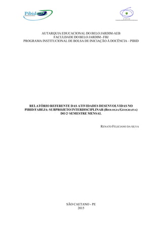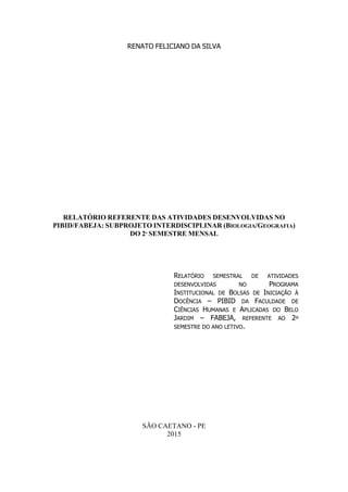 O relatório descreve as atividades desenvolvidas no segundo semestre do Projeto Institucional de Bolsas de Iniciação à Docência (PIBID) em Biologia e Geografia, incluindo monitoramento de aulas, produção de artigos científicos, confecção de maquetes, apresentações e exposições na escola.