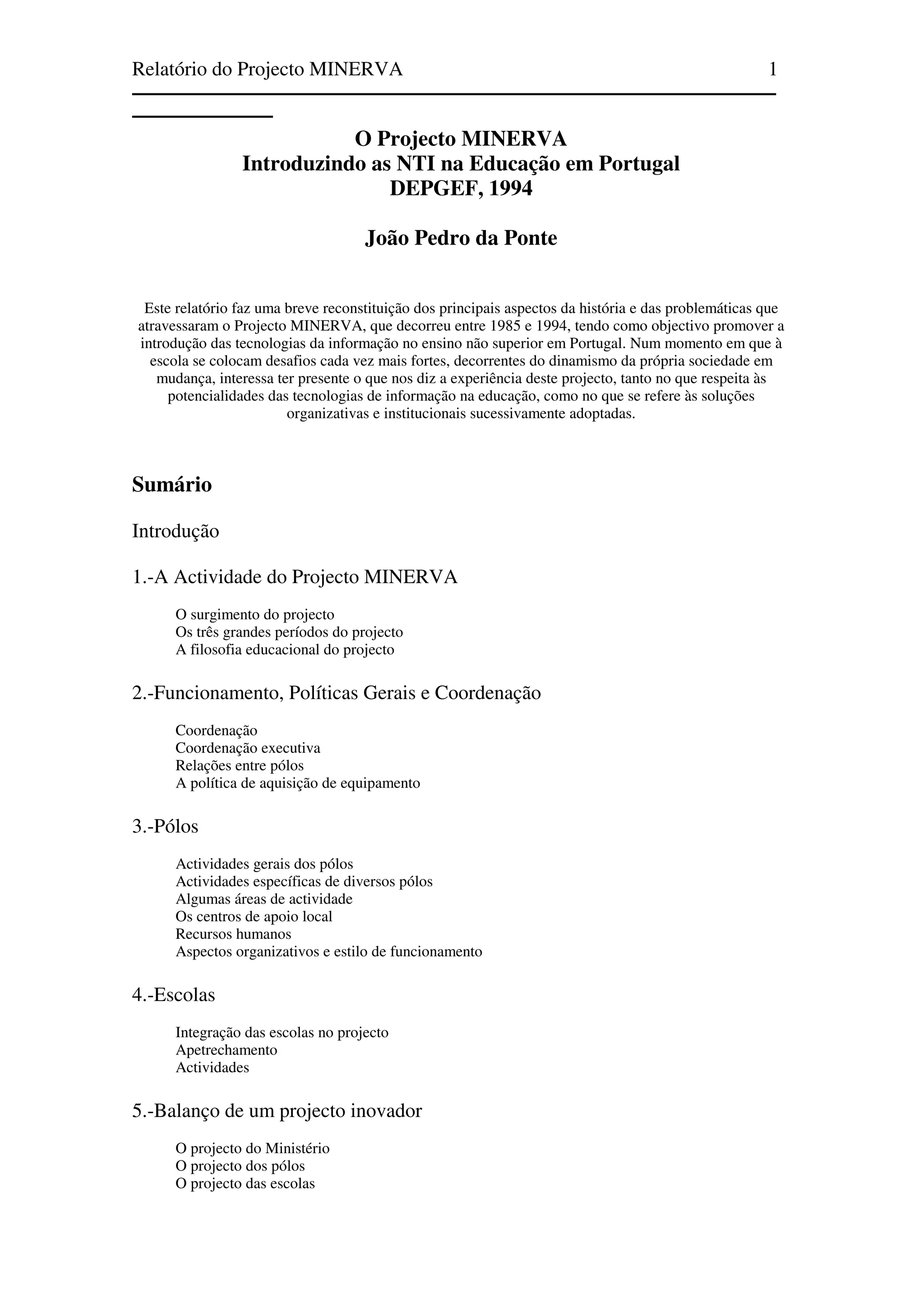 1. O projeto MINERVA teve como objetivo introduzir as tecnologias da informação no ensino não superior em Portugal entre 1985 e 1994. 2. O projeto passou por três períodos principais: a fase piloto entre 1985-1988, a expansão entre 1988-1992, e o encerramento entre 1992-1994. 3. O projeto envolveu universidades, escolas e institutos politécnicos em atividades para promover o uso educacional das tecnologias da informação.